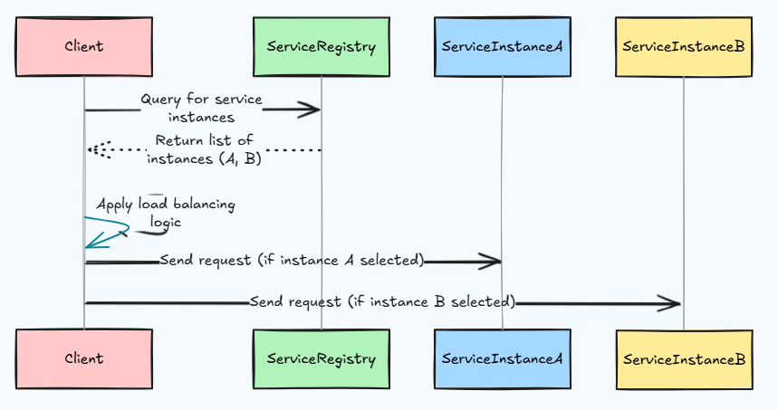 The client applies load balancing logic (e.g., random selection, round-robin) to choose an instance and sends the request directly.